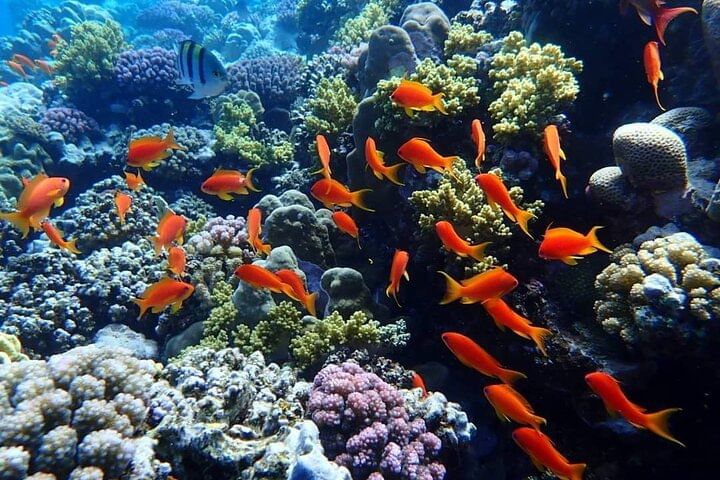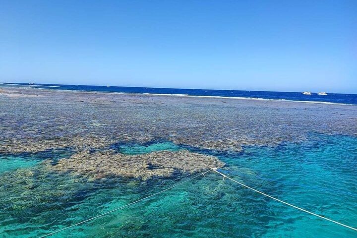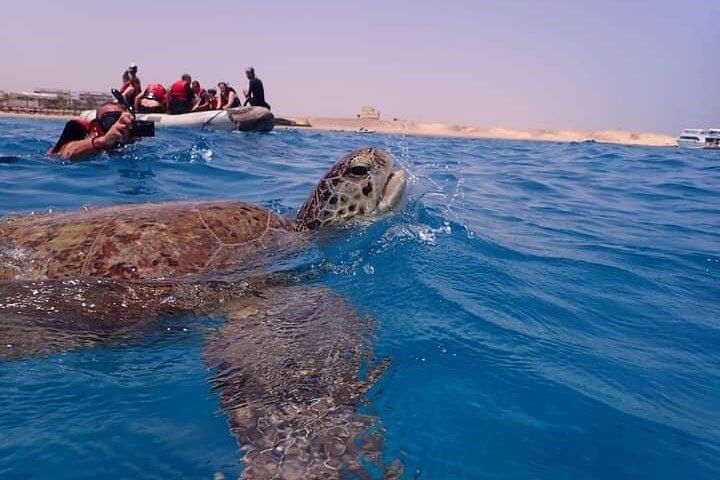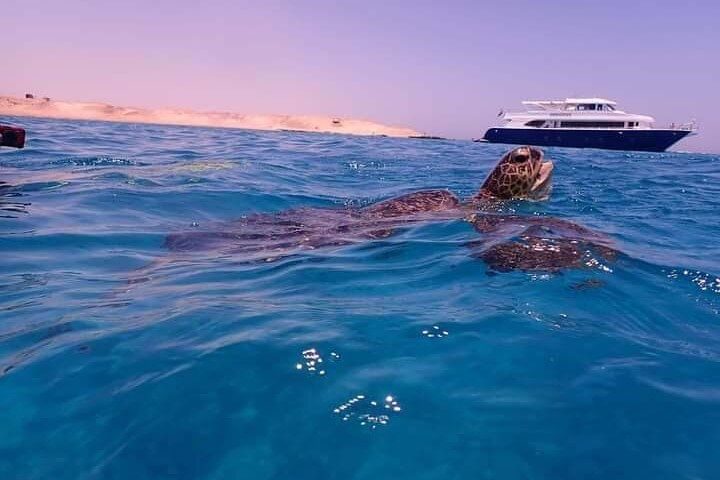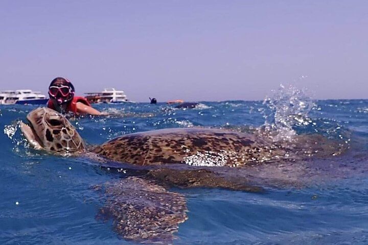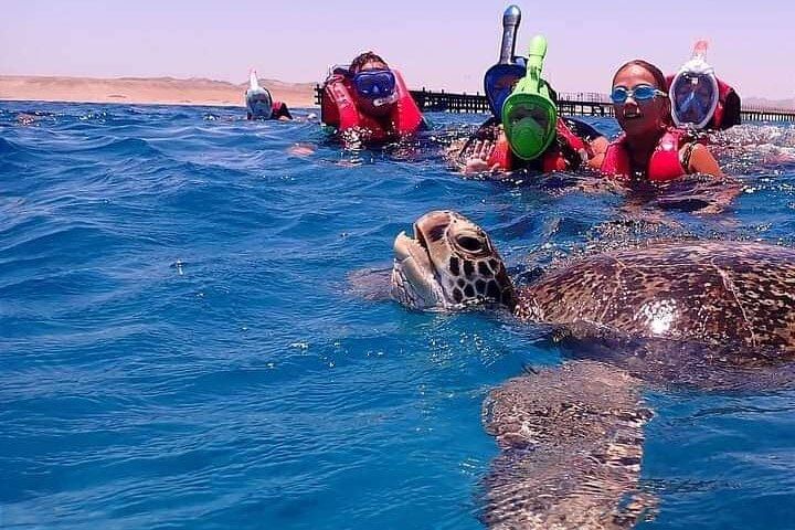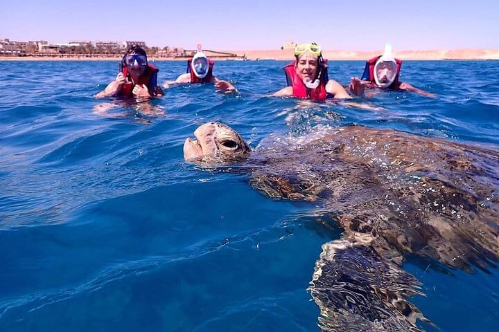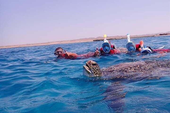 This is a fun and easy day out on the Red Sea! We pick you up from your hotel and take you to the boat. You’ll sail on a comfy yacht, stop at two amazing places to snorkel, and swim with sea turtles and colorful fish. You’ll also see beautiful coral and enjoy the clear blue water. There’s a yummy lunch on the boat, plus free soft drinks and fruits all day. All equipment is included, and friendly guides will be with you to help. It’s a great way to enjoy the sea and see amazing marine life!